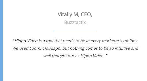 " We have checked, tested and now love it to the core. Hippo Video is the best in its class. Trust me when I say it is better than the combination of Loom, Cloudapp, Droplr and many similar tools. Hippo Video is a beast. "